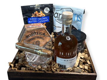A premium gift tray for the bourbon lover, featuring an old-fashioned on-the-rocks mix in a classic glass, a reserve cigar, Tortuga bourbon rum cake, sweet bourbon treats, assorted nuts including maple bourbon nuts, and rich snacking chocolates. Perfect for birthdays, corporate gifts, and special occasions.