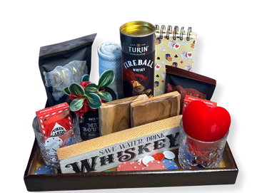 A bold and stylish gift tray curated for relaxed nights in, featuring Fireball whiskey chocolates, premium snacks, classic playing cards, a heart-accented glass, cozy details, and playful décor. Finished with rustic wood accents and a touch of humor, this tray blends masculine style with a hint of romance—perfect for celebrating love, fun, and good company.