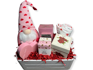 A charming Valentine’s Day basket filled with cozy and romantic touches, featuring an adorable heart-themed gnome, soft socks, rose-scented soap, a “Bee Mine” candle, sweet décor accents, and festive Valentine filler. Pretty, playful, and ready to gift, this basket is perfect for spreading love and smiles on Valentine’s Day.