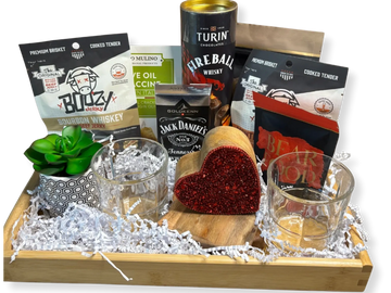 A masculine, thoughtfully curated gift tray featuring bourbon whiskey beef jerky, premium snacks, Fireball whiskey chocolates, Jack Daniel’s accents, and two classic whiskey glasses. Finished with a rustic wooden heart and natural wood tray, this gift blends bold flavors with a warm, heartfelt touch—perfect for celebrating love, appreciation, and quality time together.