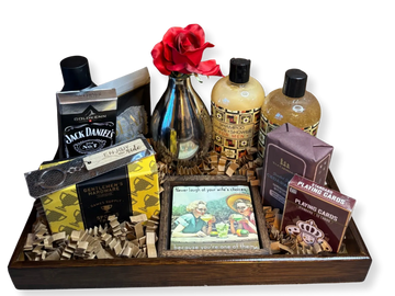 A thoughtfully curated gift tray made just for him, featuring men’s grooming essentials, classic playing cards, a Jack Daniel’s treat, game-night favorites, and a bold decorative accent. Masculine, polished, and practical, this tray is perfect for birthdays, thank-you gifts, client appreciation, or any occasion that calls for something special and well put together.