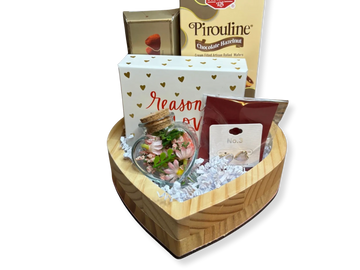 A beautifully arranged Valentine’s Day gift nestled in a wooden heart-shaped box, featuring gourmet chocolate hazelnut wafers, sweet treats, a romantic keepsake sign, delicate floral décor, and dainty jewelry accents. Thoughtful, charming, and ready to gift, this box is perfect for showing love in a simple yet meaningful way.